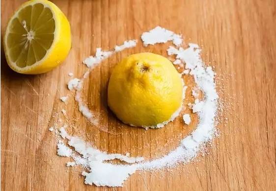 檸檬切兩半,擠壓出汁,撒上鹽,用檸檬蘸上鹽擦洗砧板表面,