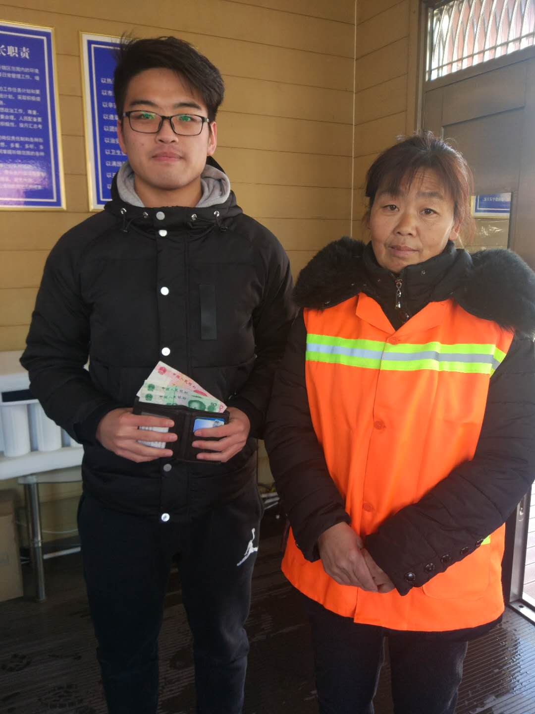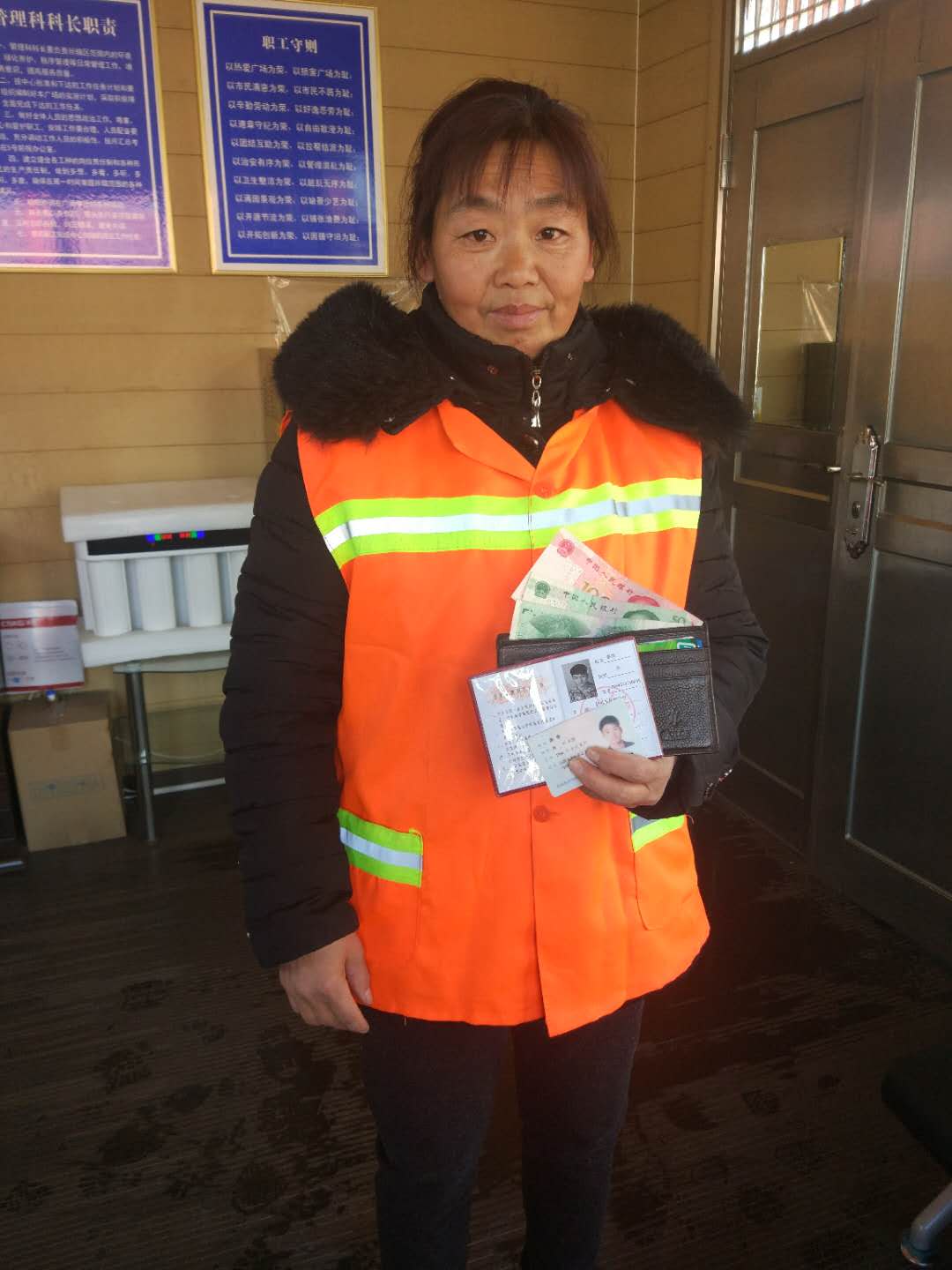 今年131日,我公司人民廣場(chǎng)保潔點(diǎn)的保潔員武彩霞在清理衛(wèi)生時(shí),撿到一個(gè)男士錢包,內(nèi)有身份證、學(xué)生證、數(shù)張現(xiàn)金,多張銀行卡等貴重物品,考慮到失主丟失物品的焦急的心情,武彩霞迅速將這一情況報(bào)至其主管處,并通過努力最終找到了失主,將錢包歸還失主。失主在取回自己的錢包時(shí),非常激動(dòng)的說:“謝謝,謝謝”。