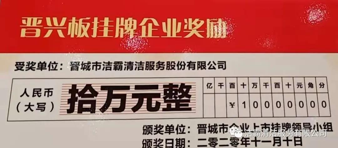 晉城市潔霸清潔服務(wù)股份有限公司于2019年11月27日成功登陸山西股權(quán)交易中心“專精特新板”(晉興板)(企業(yè)代碼:060200Z),是“專精特新板”開板暨首批掛牌的14家企業(yè)之一。“專精特新板”是山西股權(quán)交易中心設(shè)立的特色板塊,為省內(nèi)具備專業(yè)化、精細化、特色化、新穎化的優(yōu)質(zhì)企業(yè)提供專屬服務(wù),成為帶動全省中小企業(yè)創(chuàng)新創(chuàng)造、轉(zhuǎn)型升級,壯大工業(yè)高質(zhì)量發(fā)展的生力軍!皶x興板”掛牌,標志著公司正式進軍資本市場,豐富了融資渠道,推動公司高質(zhì)量轉(zhuǎn)型發(fā)展,成為公司發(fā)展的新引擎。