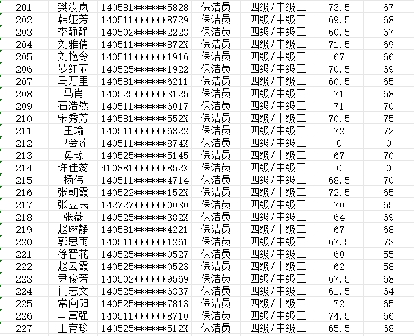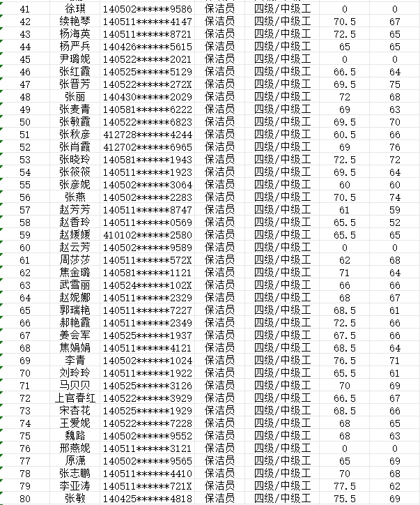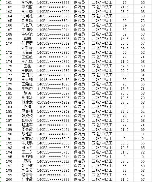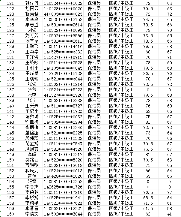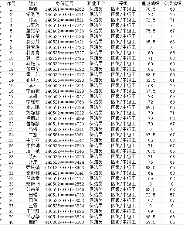 晉城市潔霸清潔服務(wù)股份有限公司職業(yè)技能等級(jí)認(rèn)定中心現(xiàn)將2024年2月4日認(rèn)定人員成績(jī)公示如下: