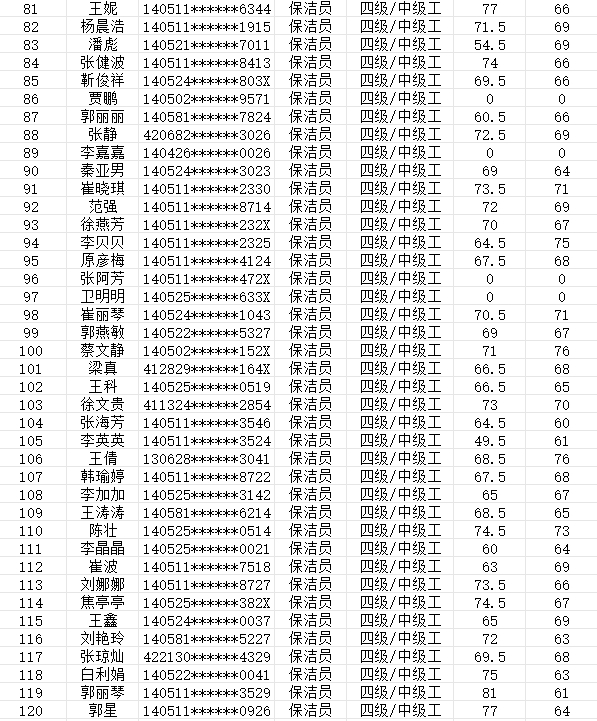 晉城市潔霸清潔服務(wù)股份有限公司職業(yè)技能等級(jí)認(rèn)定中心2024年2月4日第10批保潔員中級(jí)認(rèn)定人員成績(jī)公示