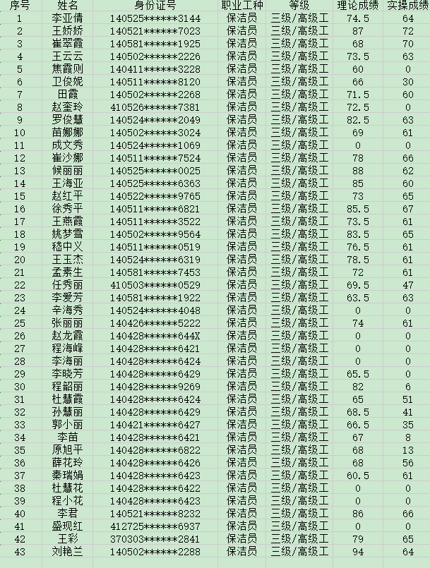 晉城市潔霸清潔服務(wù)股份有限公司職業(yè)技能等級認(rèn)定中心現(xiàn)將2024年5月12日認(rèn)定人員成績公示如下: