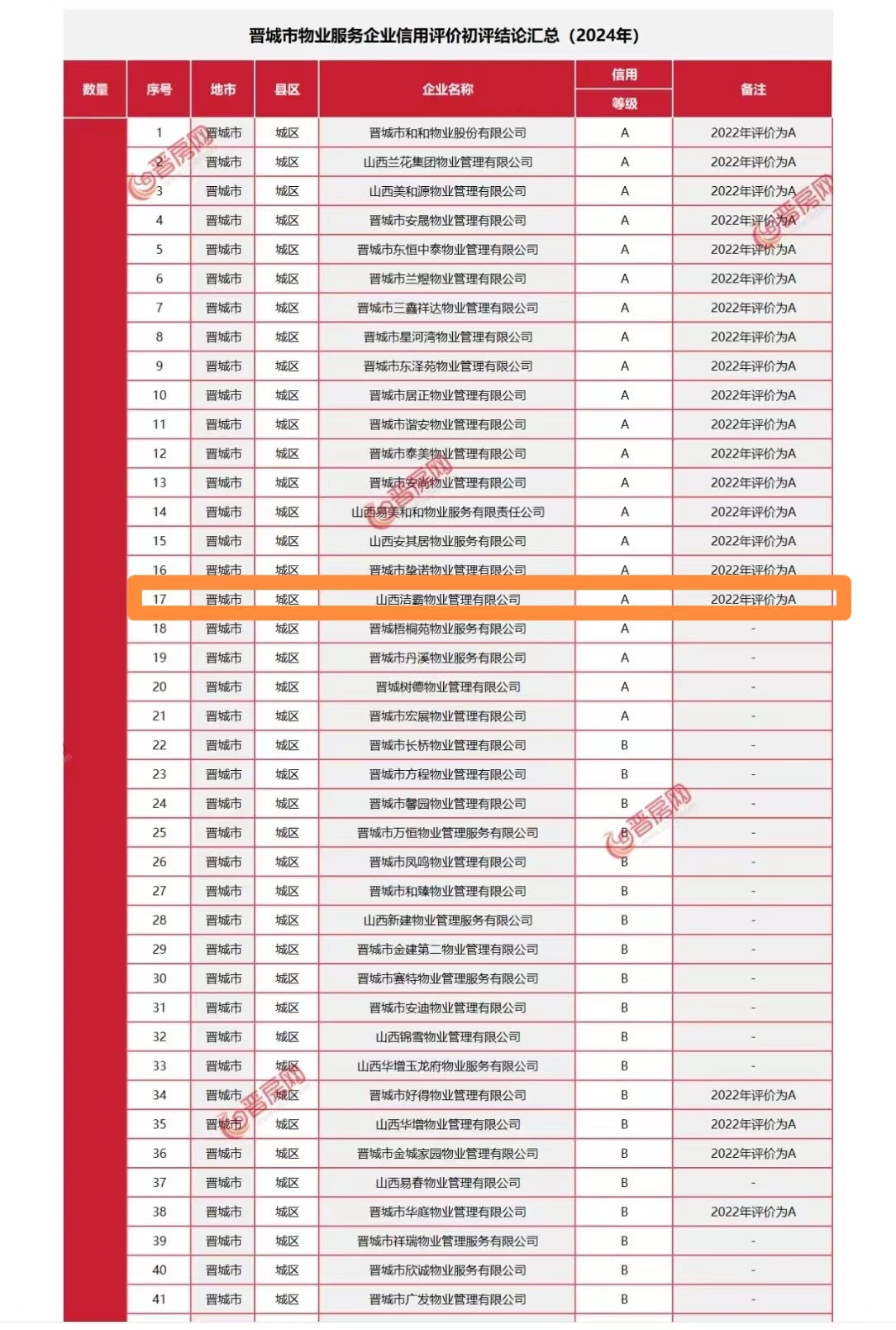 日前,山西省住房和城鄉(xiāng)建設廳發(fā)布了2023年度房地產(chǎn)企業(yè)信用評價結果的通知,根據(jù)通知顯示,晉城市共有200家物業(yè)服務公司參加評定,晉城市潔霸物業(yè)管理有限公司獲得2023年度物業(yè)服務企業(yè)信用等級A級認證。在本次考評結果中,潔霸物業(yè)光榮上榜,是對其物業(yè)服務品質的充分肯定。 |