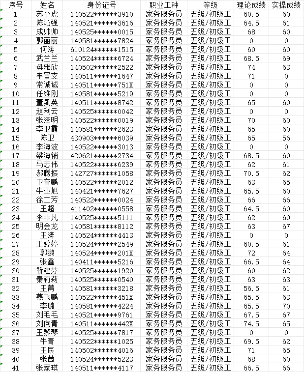 晉城市潔霸清潔服務(wù)股份有限公司職業(yè)技能等級認定中心 2024年5月26日第17批家政服務(wù)員初級認定人員成績公示