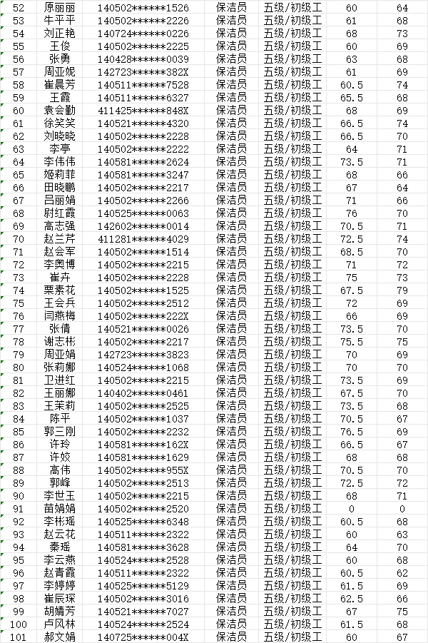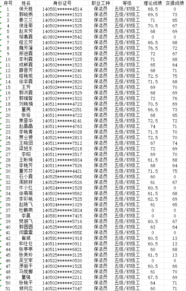 晉城市潔霸清潔服務(wù)股份有限公司職業(yè)技能等級(jí)認(rèn)定中心現(xiàn)將2024年7月28日認(rèn)定人員成績(jī)公示如下: