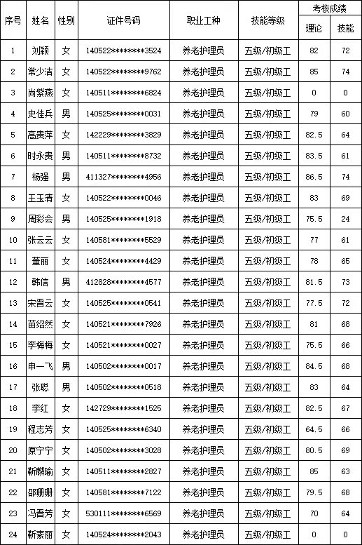 山西潔霸清潔服務(wù)集團(tuán)股份有限公司職業(yè)技能等級(jí)認(rèn)定中心2025年11月2日第1批養(yǎng)老護(hù)理員初級(jí)認(rèn)定人員成績(jī)公示