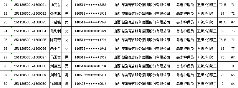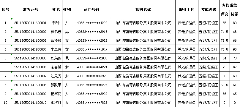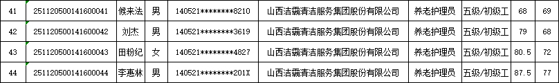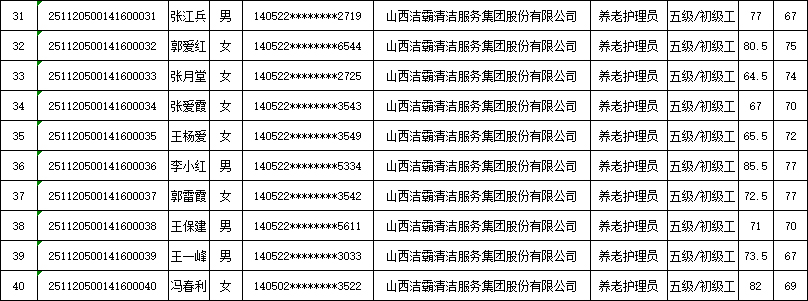 山西潔霸清潔服務(wù)集團(tuán)股份有限公司職業(yè)技能等級認(rèn)定中心2025年11月22日第4批養(yǎng)老護(hù)理員初級認(rèn)定人員成績公示